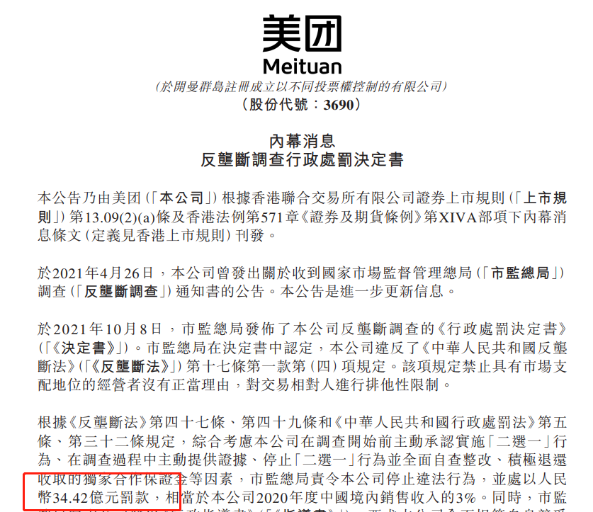 10月8日,國家市場監(jiān)管總局根據(jù)《中華人民共和國反壟斷法》第四十七條、第四十九條規(guī)定,綜合考慮美團(tuán)違法行為的性質(zhì),依法作出行政處罰決定,責(zé)令美團(tuán)停止違法行為,并處以其2020年中國境內(nèi)銷售額3%的罰款,計34.42億元。