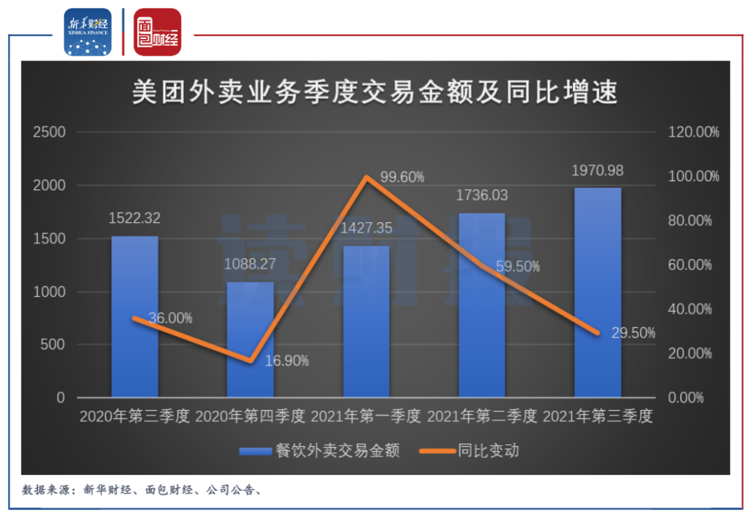 圖2:2020Q3-2021Q3美團(tuán)外賣業(yè)務(wù)季度交易金額及其同比