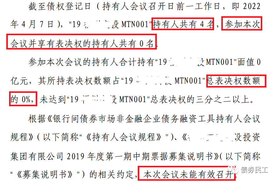 根據某城投公司2022年4月12日披露的公告,公司在2022年4月8日召開的持有人會議,參與會議的債券持有人為0名,進行表決的債券持有人占總表決數額的0%。債券持有人會議零參與的案例雖然也有,但是這個案例卻有其特殊性。
