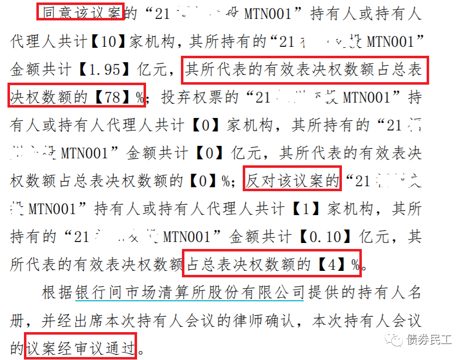 21年的MTN001發行規模2.5億元,債券持有人會議的參會比例82%,同意比例78%,反對比例4%,該議案獲得持有人會有表決通過。