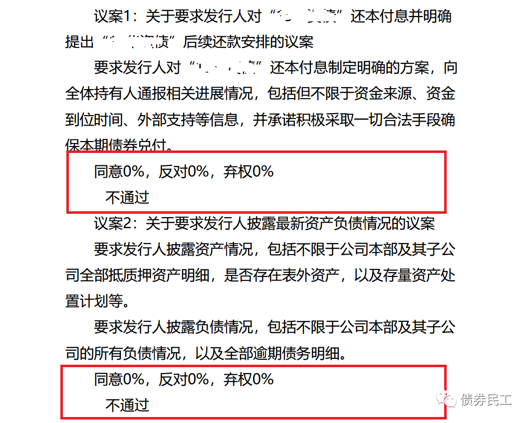 當然,這并不是第一個債券持有人零參與的持有人會議。根據某債券發行人2022年2月14日的公告信息,公司召開的持有人會議需要表決的兩個議案,兩項表決均是債券持有人同意0%,反對0%,棄權0%,實現了債券持有人的零參與。雖然這個發行人已經債券違約了,但是債券持有人會議還是要重視的,這種結果也是很少見的。