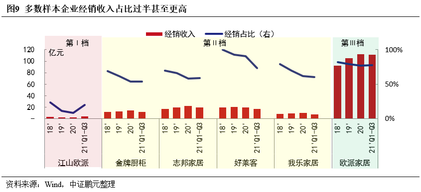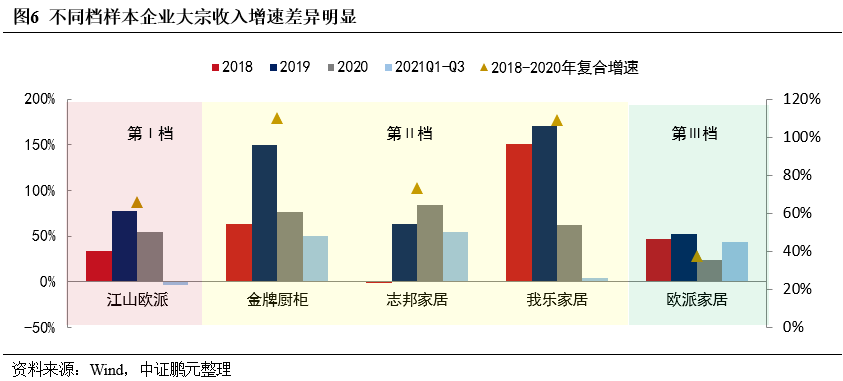 從三年復(fù)合增速看,江山歐派以大宗業(yè)務(wù)為主業(yè),其增速水平仍然不低,金牌廚柜、志邦家居、我樂家居均保持了70%以上的增速,歐派家居增速最低。從2021年前三季度大宗業(yè)務(wù)增速來看,三檔企業(yè)分化更加明顯。歐派家居仍保持增長(zhǎng),江山歐派已出現(xiàn)負(fù)增長(zhǎng),第II檔的我樂家居增速也受到重創(chuàng)。金牌廚柜和志邦家居增速受影響較小,主要是金牌廚柜的代理模式占比高,志邦家居調(diào)整客戶結(jié)構(gòu)后恒大等高負(fù)債客戶合作量大幅下降所致。