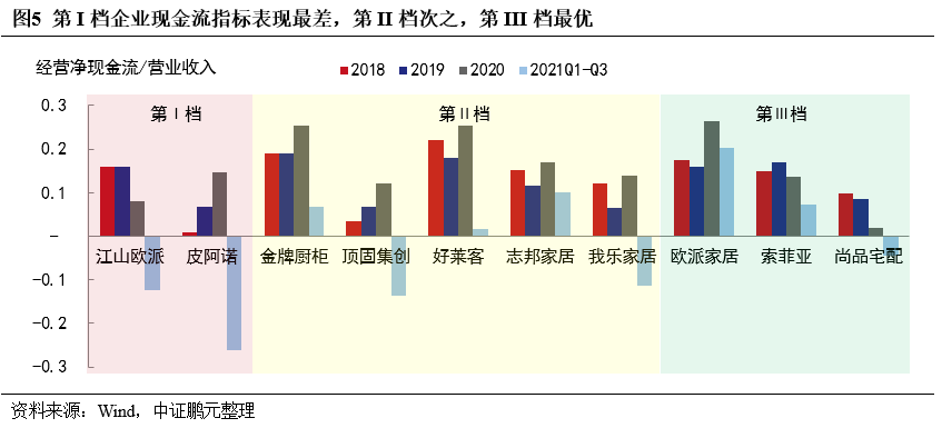 大宗業(yè)務(wù)占比高或大宗客戶風(fēng)險(xiǎn)大的樣本企業(yè)經(jīng)營(yíng)現(xiàn)金流弱化。2021年下半年以來房企流動(dòng)性緊張,直接影響定制家居企業(yè)回款。江山歐派和皮阿諾經(jīng)營(yíng)現(xiàn)金流指標(biāo)在2021年1-9月出現(xiàn)明顯的下滑,頂固集創(chuàng)由于積極推進(jìn)大宗業(yè)務(wù),業(yè)務(wù)合作保證金支出較大拖累經(jīng)營(yíng)現(xiàn)金流,我樂家居2021年半年報(bào)顯示其應(yīng)收賬款前五大均為恒大地產(chǎn)、華夏幸福及金科地產(chǎn)的關(guān)聯(lián)企業(yè)。尚品宅配不涉及大宗業(yè)務(wù),其經(jīng)營(yíng)現(xiàn)金流指標(biāo)弱化則是由于戰(zhàn)略調(diào)整,全面轉(zhuǎn)型整裝業(yè)務(wù)所致。