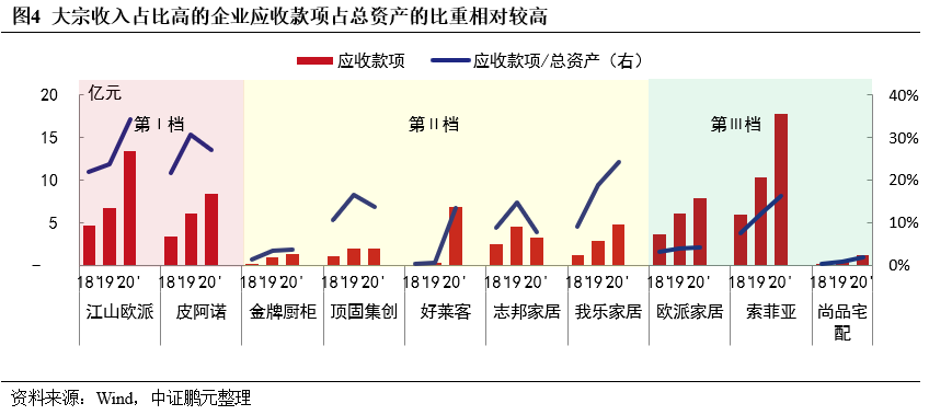大宗業(yè)務(wù)拖累定制家居企業(yè)的運(yùn)營(yíng)效率及資產(chǎn)質(zhì)量。受賬期影響,大宗業(yè)務(wù)收入占比高的企業(yè)應(yīng)收款項(xiàng)占總資產(chǎn)的比重相對(duì)更高,江山歐派和皮阿諾3年平均占比均在25.00%以上;應(yīng)收款項(xiàng)周轉(zhuǎn)天數(shù)顯著更長(zhǎng),江山歐派和皮阿諾3年平均應(yīng)收款項(xiàng)周轉(zhuǎn)天數(shù)均在100天以上。從應(yīng)收款項(xiàng)運(yùn)營(yíng)效率衡量,第I檔企業(yè)弱于第II檔,更弱于第III檔。樣本企業(yè)中江山歐派一直以大宗渠道為主,志邦家居在2017-2018年對(duì)大宗業(yè)務(wù)客戶結(jié)構(gòu)進(jìn)行調(diào)整,嚴(yán)格控制信用賬期,兩者應(yīng)收款項(xiàng)周轉(zhuǎn)天數(shù)未有明顯增長(zhǎng)。除此之外,其他樣本企業(yè)隨著大宗業(yè)務(wù)的逐步發(fā)力,應(yīng)收款項(xiàng)周轉(zhuǎn)天數(shù)持續(xù)上升。由于房企資金緊張,皮阿諾、江山歐派、頂固集創(chuàng)、我樂家居等持有的恒大商票陸續(xù)出現(xiàn)逾期,據(jù)公開披露,目前的商討方案除商票展期之外,還有以房抵債。此外恒大已向索菲亞、皮阿諾、江山歐派提前轉(zhuǎn)讓合資子公司股權(quán)抵債或緩解資金緊張,隨著到期商票規(guī)模增加,相關(guān)企業(yè)回款質(zhì)量持續(xù)弱化,應(yīng)收款項(xiàng)減值風(fēng)險(xiǎn)上升。