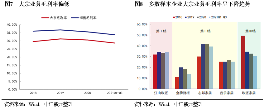大宗業(yè)務(wù)“量大利薄”,其增速放緩對(duì)第I、II檔企業(yè)及中小規(guī)模企業(yè)影響較大,未來競(jìng)爭(zhēng)加劇,其盈利空間將持續(xù)被壓縮。大宗業(yè)務(wù)經(jīng)歷2018-2019年的快速增長(zhǎng),2020年受疫情、地產(chǎn)調(diào)控等影響增速放緩,2021年以來地產(chǎn)調(diào)控升級(jí),房企資金壓力上升,雖然企業(yè)積極拓展同優(yōu)質(zhì)房企的合作,卻未能阻止大宗業(yè)務(wù)增速下滑。2021年三季度江山歐派、我樂家居的大宗業(yè)務(wù)分別同比下降24.11%和14.62%。