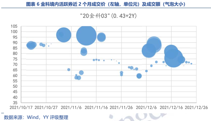 金科近兩月加強(qiáng)了債券投資人溝通,對(duì)于市場(chǎng)傳聞及負(fù)面輿情反應(yīng)也較為迅速,聲稱(chēng)無(wú)任何融資逾期。從活躍券“20金科03”成交來(lái)看,11月初及12月初曾一度跌至60元以下,隨后隨著金融監(jiān)管機(jī)構(gòu)對(duì)房企融資釋放暖意,債券價(jià)格有所回升,目前在70元檔位。