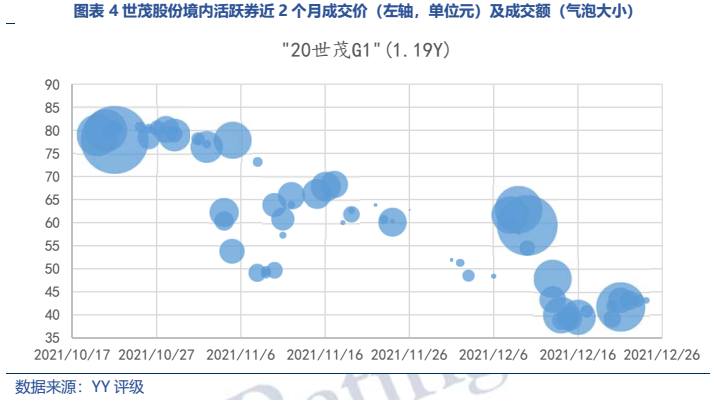 11月5日世茂股債雙殺,境內(nèi)活躍券“20世茂G1”跌至50元檔,而12月10日世茂被爆出信托展期談判后,加劇市場(chǎng)對(duì)其流動(dòng)性的擔(dān)憂(yōu),債券價(jià)格進(jìn)一步下探至40元檔。2022年一季度,世茂面臨公開(kāi)到期債務(wù)33.5億元境內(nèi)債+35.84億元供應(yīng)鏈ABS+5億元ABS。