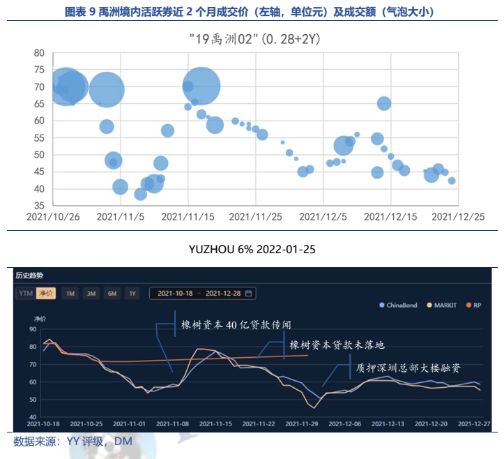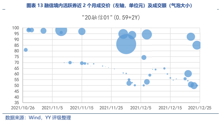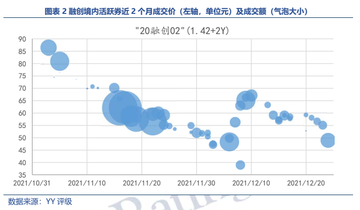 公開(kāi)信息顯示融創(chuàng)2021年12月有14億元ABS+1.5億元供應(yīng)鏈ABS到期,2022年一季度有35億元公司債+10億元ABS到期,此外訪(fǎng)談信息顯示一季度到期債務(wù)還有77億元貸款+20~30億元信托+境外融資4億元美金(有部分是質(zhì)押萬(wàn)達(dá)股票)。境內(nèi)活躍券“20融創(chuàng)02”成交凈價(jià)自10月底來(lái)一路下跌,12月初在一行兩會(huì)表態(tài)后有一波上漲,隨后繼續(xù)下跌,目前在49元左右。