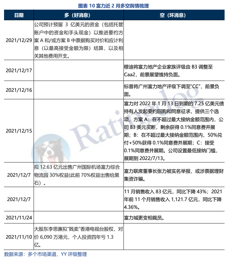 相較于今年暴露風(fēng)險(xiǎn)的民企,富力債務(wù)重壓?jiǎn)栴}盤(pán)亙已久,市場(chǎng)皆知,但公司仍通過(guò)銷(xiāo)售、資產(chǎn)出售和股東借款硬扛了許久,繼9月大股東將“倒賣(mài)”富力物業(yè)的收益借給公司后,12月公司以12.63億元清空了廣州物流園股權(quán)。面對(duì)行業(yè)下行及2022年1月到期的7.25億美元債,富力最終還是沒(méi)抗住,向持有人發(fā)起交換要約試圖將一部分債務(wù)展期支付。