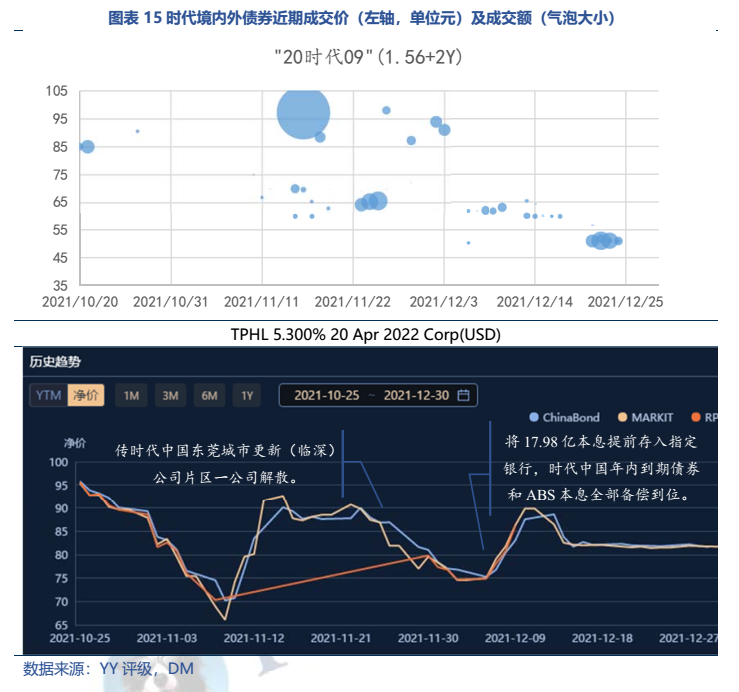 時(shí)代中國(guó)12月7日對(duì)年內(nèi)所有到期債券及ABS備償完畢,美元債價(jià)格對(duì)此產(chǎn)生積極反應(yīng),但隨后境內(nèi)外債券又出現(xiàn)下跌,市場(chǎng)猜測(cè)為公募機(jī)構(gòu)換倉(cāng)??紤]到公司舊改業(yè)務(wù)涉及較多表外融資,透明度較低,不排除存在非公開(kāi)的非標(biāo)融資輿情的可能。