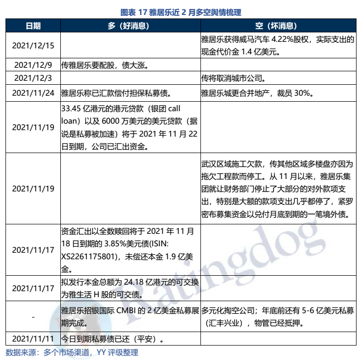 禹洲最臨近的到期公開(kāi)債務(wù)分別是2022年1月的5.79億美元債+4月35億境內(nèi)債回售+3億供應(yīng)鏈ABS,近兩個(gè)月公司主要的輿情均與再融資相關(guān):