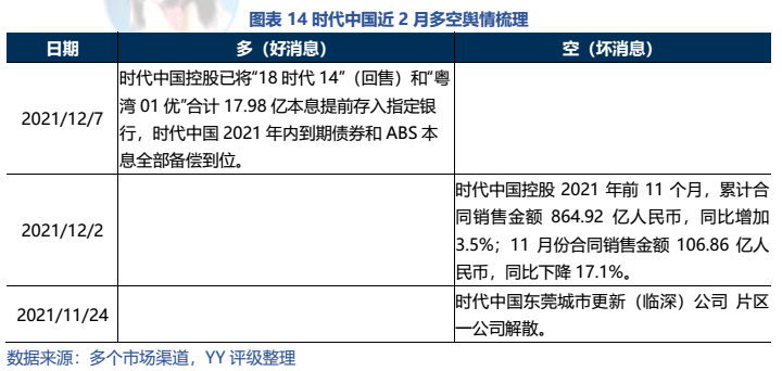 時(shí)代中國(guó)近兩個(gè)月除了還債以外,公開(kāi)信息未見(jiàn)其他動(dòng)作。時(shí)代中國(guó)短期債券到期壓力不大(2022年一季度無(wú)境內(nèi)外債券到期,最臨近到期債券為4月份4.25億境外債),除了11月24日市場(chǎng)傳出東莞城市更新公司某一片區(qū)公司解散外,暫未出現(xiàn)其他負(fù)面輿情。