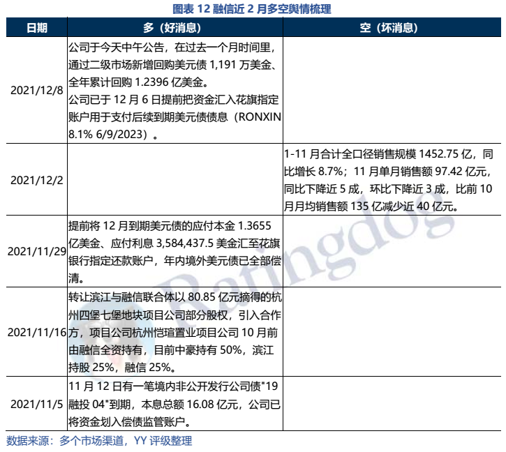 融信近兩月主要是完成年內(nèi)債券兌付,維護(hù)二級(jí)市場(chǎng)估值及轉(zhuǎn)讓項(xiàng)目股權(quán)以回籠資金: