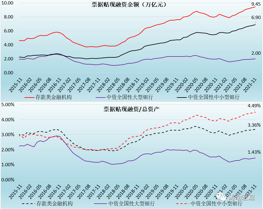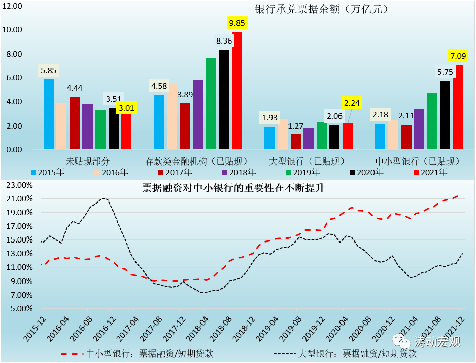 對(duì)于銀行承兌匯票數(shù)據(jù)的觀察可以從兩個(gè)指標(biāo)來看,即社融指標(biāo)的未貼現(xiàn)銀票和已貼現(xiàn)銀票,前者被視為表外融資部分(通過每月公布的社融指標(biāo)來確定),后者則通常被視為銀行的表內(nèi)業(yè)務(wù)(通過金融機(jī)構(gòu)信貸收支表來確定)。具體看,截至2021年12月底,未貼現(xiàn)銀行承兌匯票余額達(dá)到3.01萬億,金融機(jī)構(gòu)提供的票據(jù)貼現(xiàn)融資余額為9.85萬億(本外幣口徑)。其中,大型銀行和中小型銀行的余額分別為2.24萬億和7.09萬億。