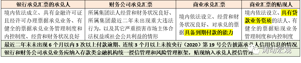 《征求意見稿》對(duì)銀票(含銀行和農(nóng)信社)、財(cái)務(wù)公司承兌匯票(含財(cái)務(wù)公司及所屬集團(tuán))以及商票的承兌人提出了一系列要求。其中有一條是明確的,即承兌人最近二年末未出現(xiàn)6個(gè)月以內(nèi)3次以上付款逾期、連續(xù)3個(gè)月以上未按央行(2020)第19號(hào)公告披露承兌人信用信息的情況。