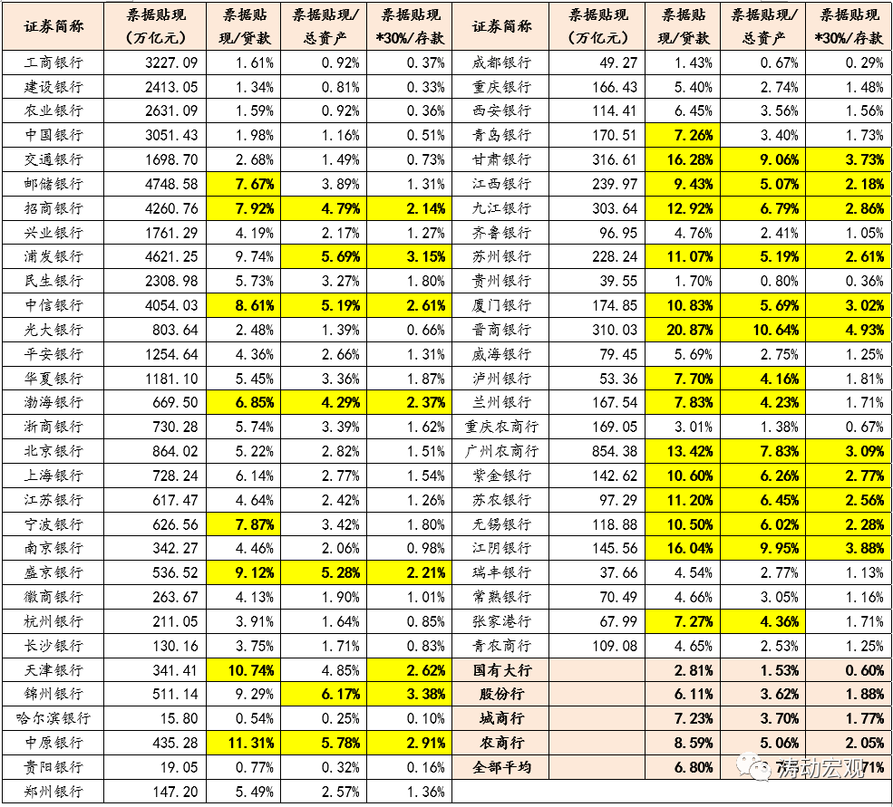 3、部分銀行的票據(jù)貼現(xiàn)余額占比明顯偏高,如23家上市銀行的票據(jù)貼現(xiàn)余額占其貸款的比例超過7%(56家上市銀行的平均水平為6.80%)、21家上市銀行的票據(jù)貼現(xiàn)余額占其總資產(chǎn)的比例超過4%(56家上市銀行的平均水平為3.70%)、19家上市銀行的票據(jù)保證金(按貼現(xiàn)余額的30%計(jì)算)占其存款的比例超過2%(56家上市銀行的平均水平為1.71%)。