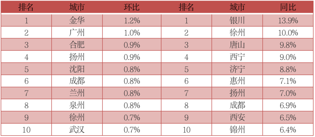 分城市來看,環比排名中,金華漲幅最快,廣州第二、合肥第三,同比排名中,銀川漲幅最快,徐州第二、唐山第三。