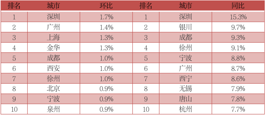 分城市來看,環比排名中,深圳漲幅最快,廣州第二、上海第三,同比排名中,也是深圳漲幅最快,銀川第二、成都第三。