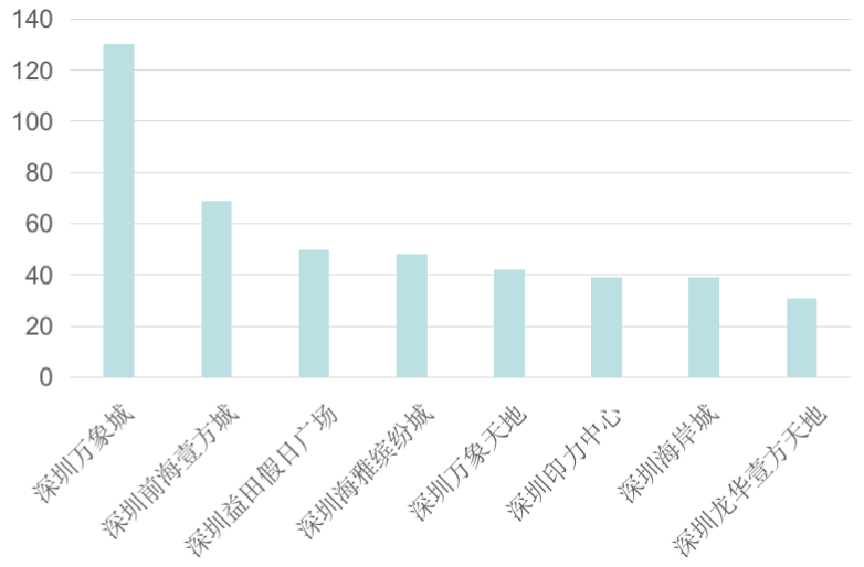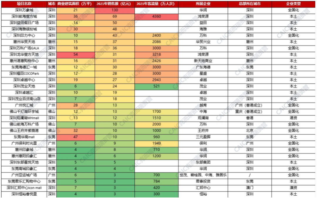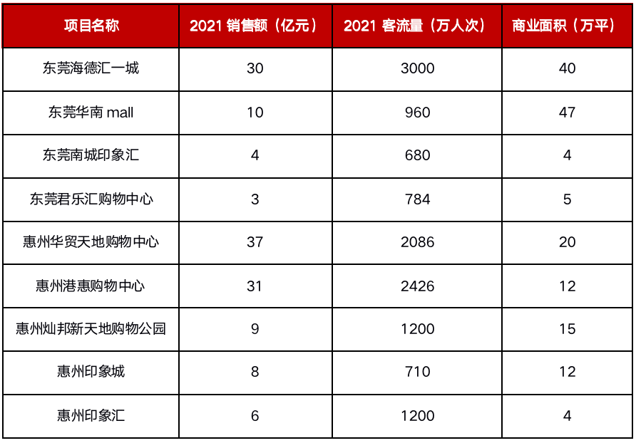 東莞惠州標桿級項目則較少。2021銷售額百強項目排名中,惠州華貿天地購物中心以36.5億銷售額位列第52位,惠州港惠購物中心以31億銷售額位列第58位,東莞海德匯一城以30億銷售額位列第71位。