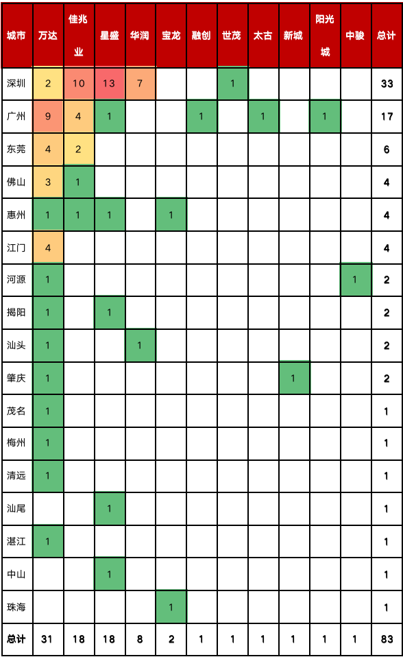 從企業項目分布來看,萬達布局數量最多,范圍最廣;佳兆業、星盛擁有本土優勢,在廣深形成“寡頭”效應;華潤高度聚焦深圳,其他企業布局則較為分散。
