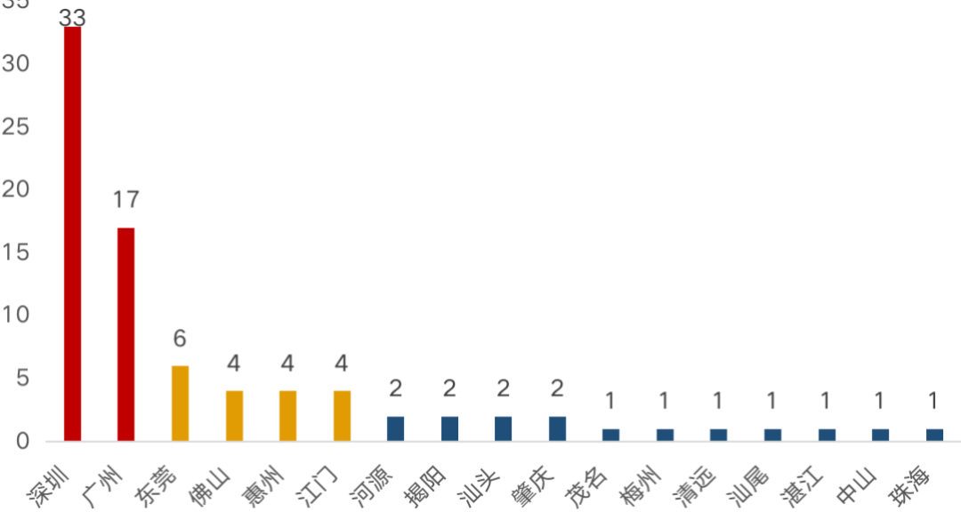 其中深圳數量遙遙領先,廣州位于其后;東莞、佛山、惠州、江門處于第二梯隊,其他城市關注度較低。整體來看熱度集中,深度下沉不夠,廣深“能進則進”,都市圈城市擇機進駐,其他城市“能不進就不進”。