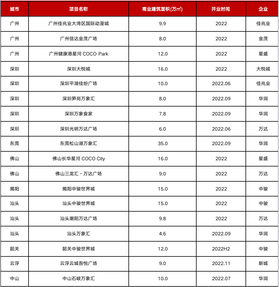 從2022年擬開業項目情況來看,即便現有項目“水土不服”,房企依然沒有停下對珠三角的探索。中駿、新城、萬達在企業戰略定位的導向下,向汕頭、韶關、云浮等更低能級城市進駐,而對于金茂、大悅城等首入珠三角的房企來說,廣深依然是最安全的選擇。