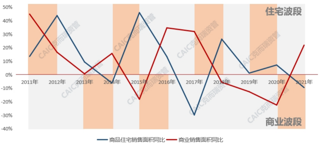 八城住宅與商業銷售周期背離,兩者存在約3年差異