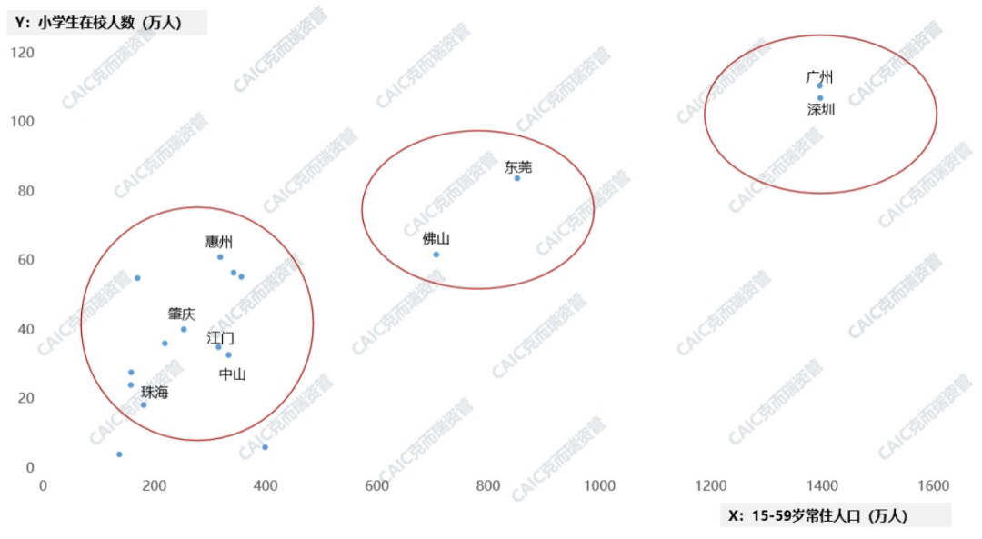 從人口基數來看,深圳為人口流入最多的廣東城市;廣州常住人口最多,同時也有穩定的人口流入;東莞佛山依然位于第二梯隊,遠超其他三四線城市;肇慶整體人口流失。從人口結構來看,廣深小學生人數最多,消費“流量”穩定,且青年人口居多,消費活力充足;東莞佛山次之,其他城市較弱,整體人口格局未變。