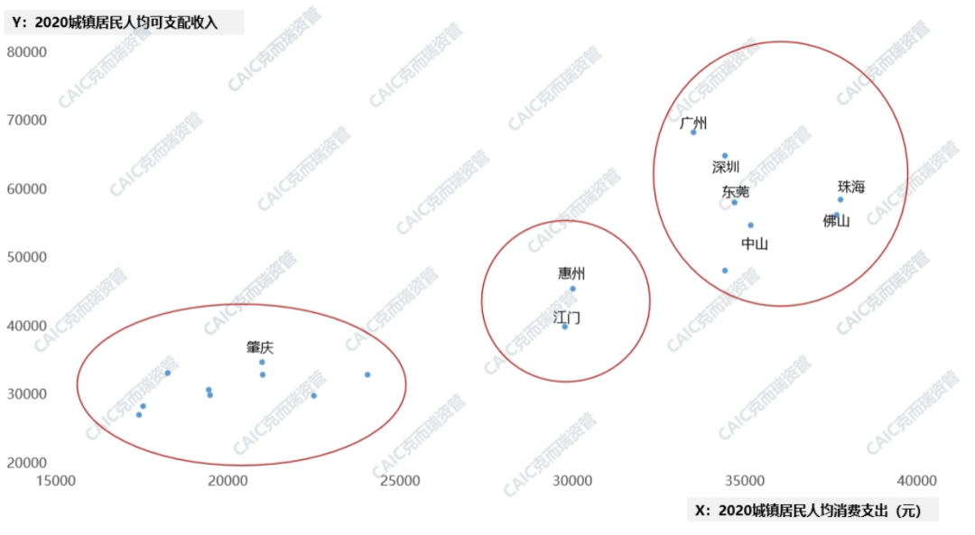 廣州、深圳、東莞等城市組團的人均可支配收入、人均消費支出也很高,屬于“有錢肯花”的城市,消費旺盛,商業發展潛力足。而肇慶等低能級城市消費水平則顯著較弱決定了在這些城市做商業的風險和天花板。