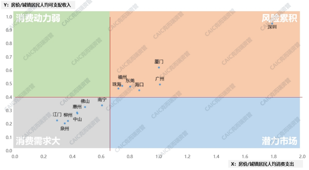 房價占人均可支配收入越高,房價與人均消費支出占比越高,意味著房產消費對商業消費產生了抑制作用。對珠三角及周邊城市數據分析來看,對于商業地產投資來說,深圳等高能級城市房價對消費抑制的風險正在累積,而低能級的消費需求仍需要進一步釋放。