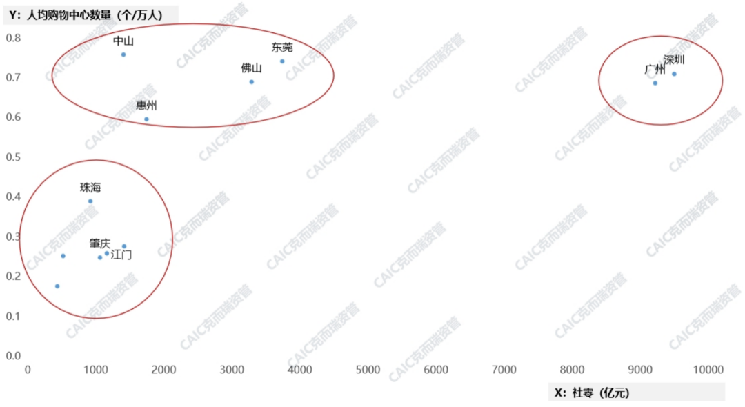 從城市人均購物中心數量和社零的對比來看,廣州、深圳社零基本面較好,城市整體商業面積仍未滿足人口消費需求,天花板較高,商業仍有發展空間。而中山、惠州、佛山、東莞市場飽和已顯現,珠海、肇慶、江門仍處于購物中心稀缺階段。