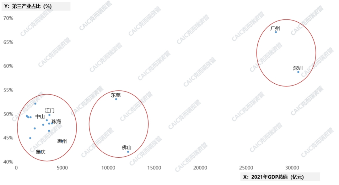 圖:2021年廣東各城市GDP及第三產業占比(億元、%)