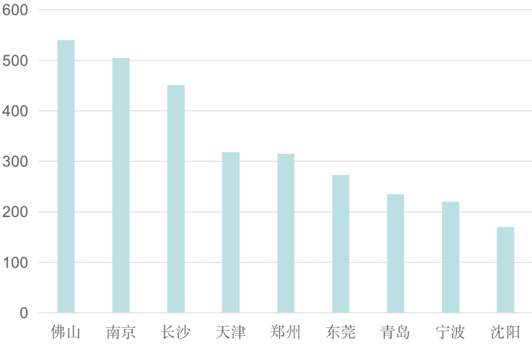 從項目分布上看,珠三角城市商業項目高度集中于廣深,東莞、佛山處于第二梯隊。佛山:2020年佛山新開業項目體量排全國第三,在華南僅次于廣州,2021年佛山新開購物中心39家,領跑廣東,新增供應252.1萬㎡,延續市場競爭白熱化狀態。