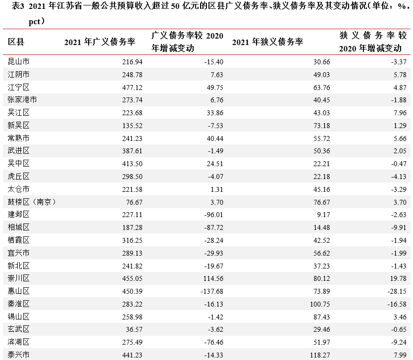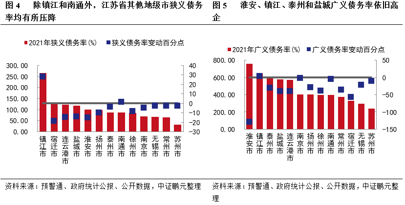 債務(wù)情況:鎮(zhèn)江市化債壓力依舊較大,洪澤區(qū)、高港區(qū)和京口區(qū)狹義債務(wù)率增加明顯,但江蘇省區(qū)縣級債務(wù)率整體仍有壓降。地級市層面,2021年除鎮(zhèn)江和南通外,其余地級市狹義債務(wù)率均有所壓降,2021年鎮(zhèn)江狹義債務(wù)率上升27.91個百分點至265.59%,淮安、鎮(zhèn)江、泰州和鹽城的廣義債務(wù)率依舊較高。區(qū)縣層面,2021年洪澤區(qū)、高港區(qū)、丹徒區(qū)和泗陽縣狹義債務(wù)率超過200%,債務(wù)負擔(dān)較重。蘇州市、無錫市和常州市因財政實力較強,下轄區(qū)縣狹義債務(wù)率整體偏低,2021年江蘇省95個區(qū)縣中有55個區(qū)縣狹義債務(wù)率較2020年有所壓縮,其中淮安區(qū)狹義債務(wù)壓縮最明顯(下降81個百分點),2021年新沂市和洪澤區(qū)廣義債務(wù)率分別超過900%和700%,大豐區(qū)、連云區(qū)、高淳區(qū)、海州區(qū)、浦口區(qū)和溧水區(qū)廣義債務(wù)率亦高于600%,但95個區(qū)縣中有61個區(qū)縣廣義債務(wù)率較2020年有所壓降。