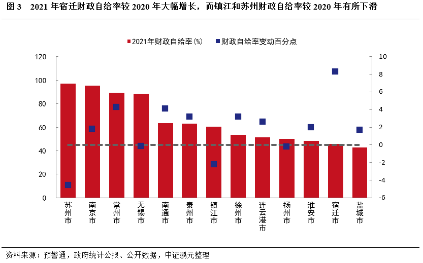 財政自給率方面,2021年蘇州和鎮(zhèn)江財政自給率較2020年分別下滑4.59個百分點、2.20個百分點至97.15%和60.29%,無錫和揚州財政自給率基本和2020年持平,宿遷財政自給率提升較為明顯,2021年宿遷財政自給率上升8.28個百分點至45.80%,主要系2021年宿遷綜合財力較2020年增加明顯,且一般公共預(yù)算支出變動不大所致。