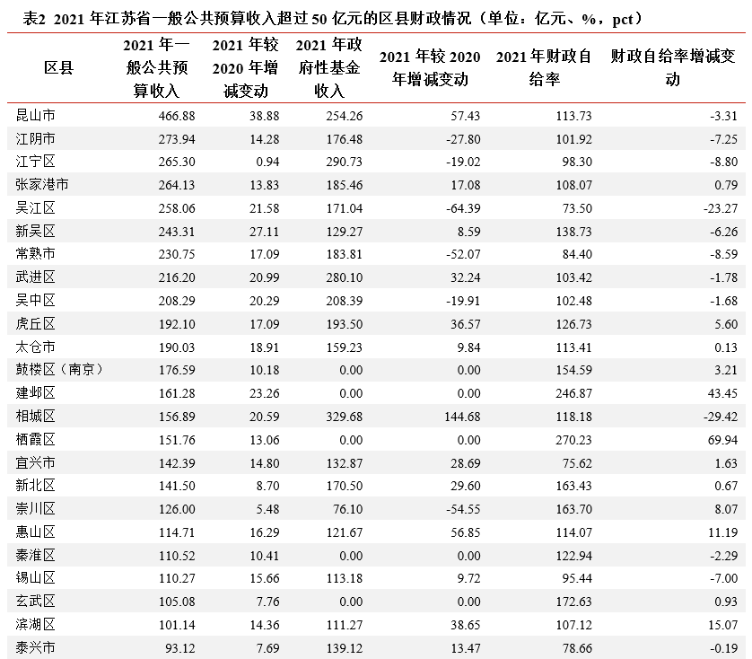 2021年江蘇省絕大部分區(qū)縣一般公共預(yù)算收入較2020年均有增長,但18個區(qū)縣政府性基金收入下滑,33個區(qū)縣財政自給率表現(xiàn)弱于2020年。一般公共預(yù)算收入方面,2021年昆山、江陰和江寧區(qū)一般公共預(yù)算收入仍穩(wěn)居頭部,邗江區(qū)一般公共預(yù)算收入較2020年下滑5.70億元至54.41億元。受2021年房地產(chǎn)市場疲軟影響,2021年江蘇省有18個區(qū)縣政府性基金收入較2020年有所下滑,其中吳江區(qū)下滑幅度最大,當年政府性基金收入下滑64.39億元至171.04億元。2021年崇川區(qū)、常熟市和江陰市政府性基金收入較2020年分別下滑54.55億元、52.07億元和27.80億元。財政自給率方面,2021年江蘇省95個區(qū)縣中有33個區(qū)縣財政自給率表現(xiàn)弱于去年,相城區(qū)、京口區(qū)、天寧區(qū)、吳江區(qū)和鐘樓區(qū)財政自給率較去年同期下降20個百分點以上。