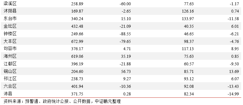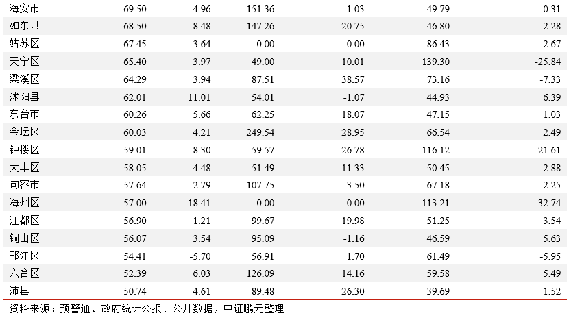 財政情況:2021年宿遷財政自給率大幅提高,95個區(qū)縣中有33個區(qū)縣財政自給率表現(xiàn)弱于去年。2021年江蘇省各地級市一般公共預(yù)算收入和政府性基金收入均較2020年有所提高,2021年宿遷財政自給率表現(xiàn)亮眼,較2020年提高8.28個百分點至45.80%,蘇州、南京、常州和無錫經(jīng)濟實力依舊較強、財政自給率依舊較高。區(qū)縣層面,2021年江蘇省絕大部分區(qū)縣一般公共預(yù)算收入和政府性基金收入均有所增長,昆山、江陰和江寧區(qū)一般公共預(yù)算收入仍穩(wěn)居頭部,但2021年邗江區(qū)一般公共預(yù)算收入下滑5.70億元至54.41億元,吳江區(qū)政府性基金收入下滑64.39億元至171.04億元,相城區(qū)、京口區(qū)、天寧區(qū)、吳江區(qū)和鐘樓區(qū)財政自給率較去年同期下降20個百分點以上。