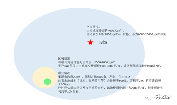 某三線城市的產(chǎn)業(yè)勾地項目,處于城市發(fā)展外圍的工業(yè)園區(qū)附近,距市政府車距20km+,總體規(guī)劃占地面積近千畝,其中產(chǎn)業(yè):配套住宅=1:2,首期已取得200畝產(chǎn)業(yè)+400畝住宅,住宅樓面價2200元/㎡,無溢價。