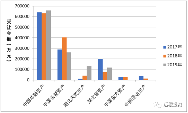 與去年相同,華融資產(chǎn)、長(zhǎng)城資產(chǎn)兩家收購(gòu)量依舊搶眼,作為一級(jí)市場(chǎng)主要持牌AMC受讓方占據(jù)接近80%的市場(chǎng)份額。而成立于2016年底的湖北天乾資產(chǎn)后來(lái)居上,受讓金額逐年攀高。