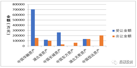 圖中數(shù)據(jù)為持牌AMC在整個(gè)不良市場(chǎng)所有收包、出包金額統(tǒng)計(jì),僅根據(jù)當(dāng)前數(shù)據(jù)統(tǒng)計(jì),湖北省資產(chǎn)和湖北天乾資產(chǎn)收、出包金額較平衡;華融、長(zhǎng)城收包>出包金額,東方、信達(dá)由于成交記錄未透露具體債權(quán)金額,暫不予分析。
