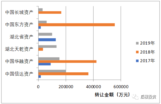 從上圖所知,各家持牌AMC間轉(zhuǎn)讓金額“貧富差距”并不像18年那么大,平緩消耗自家?guī)齑媪俊?/p>