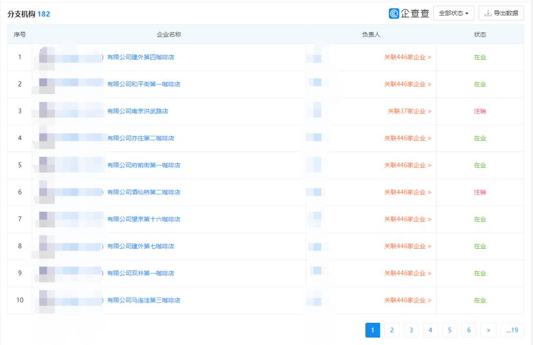 以某咖啡公司為例分析,僅某咖啡(北京)有限公司設(shè)立的分支機(jī)構(gòu)就有182家,在使用【通用】甄別初選后,還剩下100+的數(shù)量需要再做【專用】甄別,評估實際運營情況。