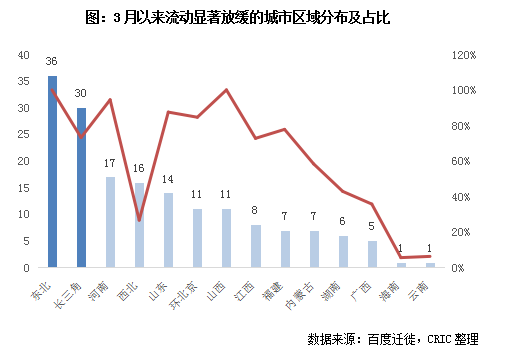 為了探知3月以來(lái)有多少城市曾經(jīng)或正在“慢下來(lái)”,我們以連續(xù)7天百度遷徙指數(shù)同比降幅超過(guò)50%作為該城市日常流動(dòng)顯著放緩的標(biāo)準(zhǔn),測(cè)算了全國(guó)365個(gè)城市或地區(qū)在3月以來(lái)的遷徙指數(shù)變化情況。最終,我們發(fā)現(xiàn),在此標(biāo)準(zhǔn)下,約有170個(gè)城市在3月后出現(xiàn)流動(dòng)放緩的現(xiàn)象,占比高達(dá)47%。