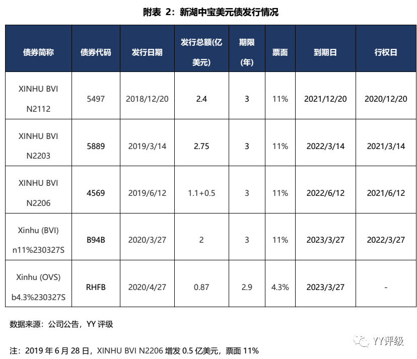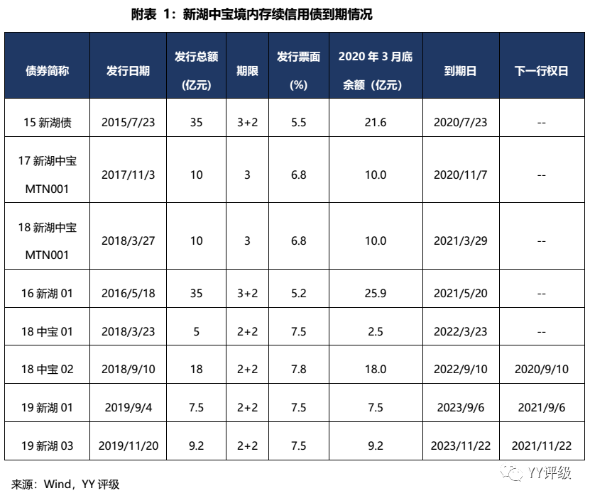 截至2020年3月末,不考慮行權情況下,新湖中寶一年內境內信用債到期壓力為41.6億元,ABS到期額11.35億元,無境外美元債到期,合計52.95億元;進一步考慮行權,假設全部行權,則再增加境內信用債18億元和美元債5.15億美元,合計107億元。考慮市場信心不足,可能選擇行權的機構較多,壓力測試應按107億來核算。