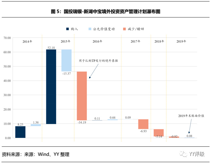 新湖中寶的金融+科技布局中,對中信銀行的投資額最大,當前市場價值最高。公司于2015年投向國投瑞銀境外資管計劃62億,其中52億元投向了國投瑞銀-新湖中寶境外投資資產管理計劃(下稱“資管計劃”)。根據公司公告,資管計劃主要用于認購BVI公司Total Partner Global Limited(以下簡稱“Total Partner”)發行的境外票據。Total Partner的全資BVI子公司Summit Idea Limited(以下簡稱“Summit Idea”),以國投瑞銀對境外票據的認購金額配合相關銀行貸款,認購UBSLondon持有的22.93億股中信銀行H股股份,認購價為每股5.73港元,認購后股份由Summit Idea持有。根據公司年報,我們繪制了資管計劃賬面價格變動瀑布圖(見圖5),推測該資管計劃對境外票據的認購金額為34億元。另外10億元則是投向了國投瑞銀新湖中寶境外資產配置1號資產管理計劃,該筆投資在當年賺了100萬之后就進行了贖回,2016年又投了2.7億元,大部分在之后三年進行了贖回,虧損部分金額不大,2019年末賬面余額2萬元,基本清零。
