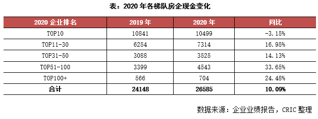 從各梯隊來看,持有現金量跟房企規模大體成正比,TOP10房企仍擁有著絕對的領先地位。從增速來看,TOP10房企的現金持有量同比減少了3.15%,是唯一現金減少的梯隊。值得注意的是,TOP50+梯隊的房企現金增幅相對較大,同比增長達到20%以上,在“三條紅線”的共識下,中小型房企意圖建立更強的風險抗擊能力,加大持有現金量以應對更加復雜的市場環境。