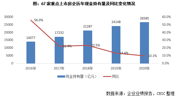 2020年末67家重點上市房企的現金持有量為26585億元,同比增長10.1%,增速較2019年下降3.35個百分點。現金持有量同比增速由2016年的56.0%的增速下降到2020年的10.1%,呈下降趨勢,且近兩年逐漸下降到一個相對穩定的區間,主要在于隨著政策持續調控,近兩年行業已經進入緩慢增長期,疊加近期三條紅線的調控出臺,短期內現金的增長也相對平穩。