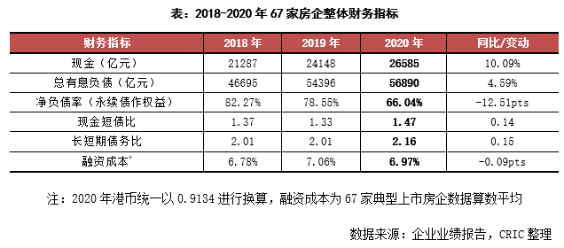 自從2020年8月底政府頒布三條紅線監管指標以來,三條紅線就成為房企改善財務狀況的一個重要衡量標準。從67家重點房企2020年底的財務情況來看,其現金短債比的算數平均值為1.8,中位數為1.61;凈負債率的算數平均值為75.99%,中位數為68.31%,現金短債比和凈負債率兩項指標基本都能達標。僅有剔除預收款后的資產負債率無論是算術平均還是中位數都均超70%,未來將是房企改善的重點。