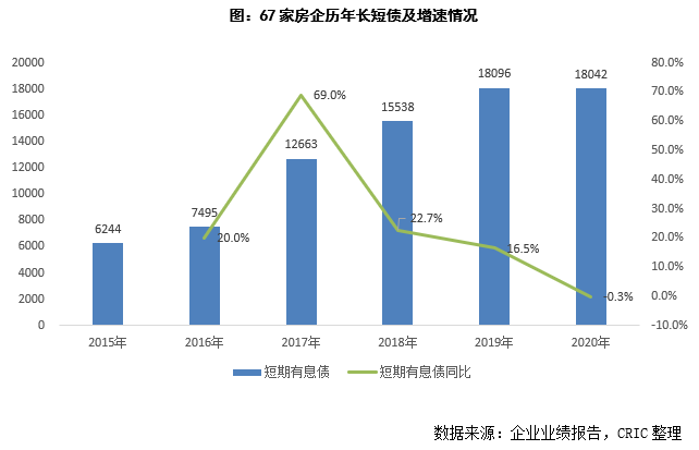 從有息債的期限結構來看,2020年末67家房企的短期有息債18042億元,同比下降0.30%,近五年來首次出現同比下降的情況,而此前短債的年同比增速均保持在20%左右的水平;同時,2020年末長期有息債39008億元,同比增長7.09%。三條紅線出臺后,可以看到房企的有息債增速進一步下降,同時由于“三條紅線調控中其中的一條紅線為現金短債比不得小于1的硬性指標,房企積極調整負債結構,積極贖回短債,確保過線。