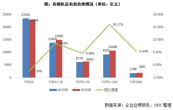 從各梯隊的表現來看,2020年末 TOP10房企的總有息債規模實現負增長,同比下降2.39%至22866億元。除了TOP10以外其余四個梯隊的房企均實現了總有息債的增長, TOP51-100的房企增幅最大,同比增長16.11%至10688億元,而TOP31-50及TOP100+梯隊的房企增速相對較小。可以看到,房企整體的有息債增長較為緩慢且均衡,但各個梯隊的變動有所分化,部分頭部房企主動追求降杠桿,TOP11-30和TOP51-100等規模擴張的房企則增長相對較大,TOP31-50及TOP100+的房企求穩,增長較小。